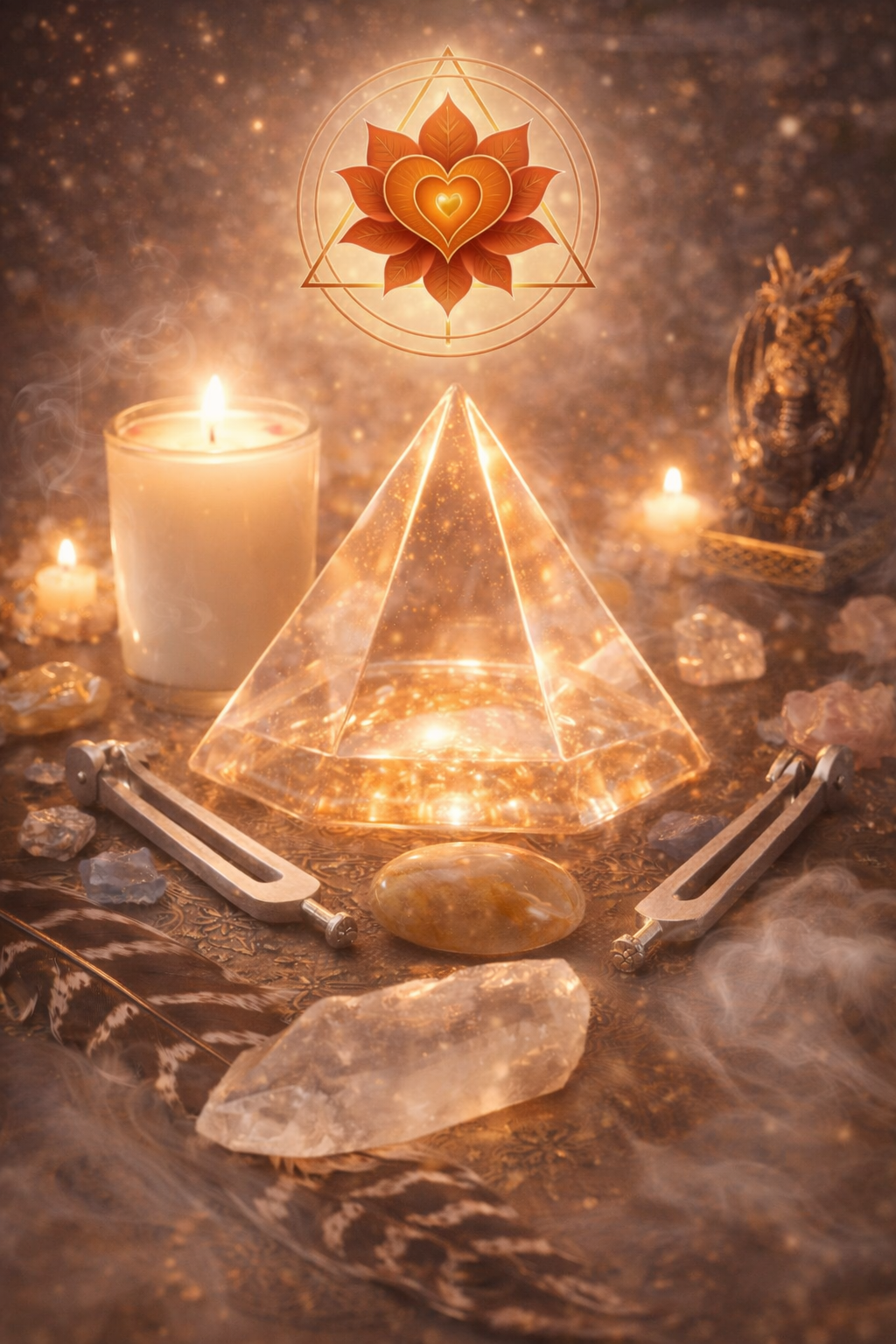 This grounding is supported through high-vibration healing frequencies—sacred tuning forks, crystal pyramids, and a crystal gift each participant receives—helping to harmonize and support the heart’s opening.